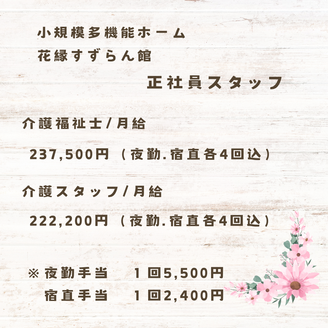 223,200円~/月 無資格 (処遇改善手当加算含)夜勤4回含む 238,200円~/月 介護福祉士 (処遇処遇手当加算含)夜勤4回含む 各種手当 介護福祉士手当 月 10,000円 ケアマネ手当 月 10,000円 宿直手当 1回2,400円 夜勤手当 1回 5,500円 月4~5回 (回数については相談に応じます) 配偶者扶養手当 月 5,000円 子供手当 月 5,000円(1人につき) 家賃手当 月 10,000円(規定あり) 通勤手当 車通勤は距離により支給 上限 8,000円 バス通勤 運賃により実費支給(上限あり) 賞与 毎年5月と11月に支給 |